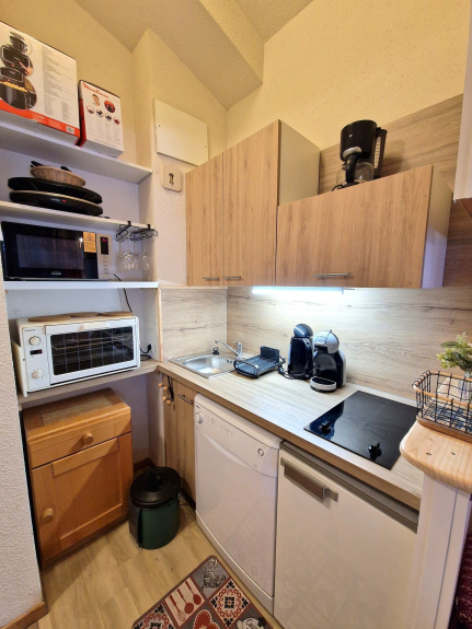 - Cucina con 2 piastre elettriche, frigorifero, mini-forno, lavastoviglie, filtro Dolce Gusto e macchina per il caffè a cialde.