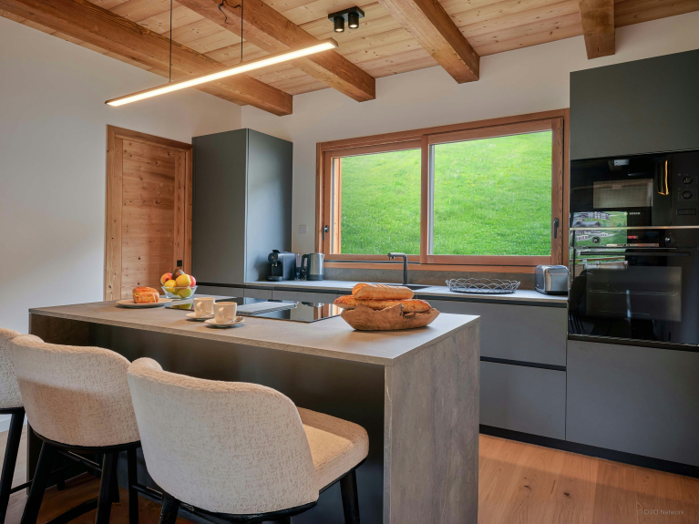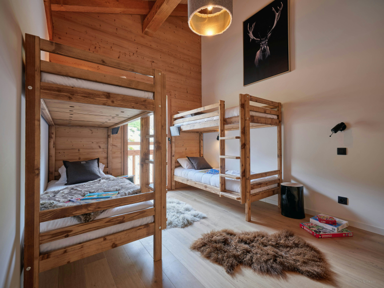 Al piano superiore si trovano due camere matrimoniali e un dormitorio con letti a castello per quattro persone, pensato per i bambini. Una delle camere doppie dispone di un balcone privato e di un bagno privato con doccia e servizi igienici, mentre le altre condividono un bagno con vasca e doppio lavabo, oltre a una toilette separata.