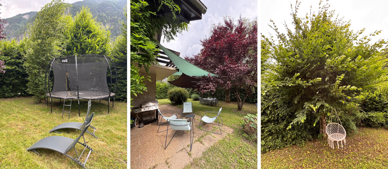 All'esterno si trova un ampio giardino privato, con trampolino e tavolo da ping pong in estate, e un parcheggio custodito per due auto nel terreno (più un terzo posto nel condominio). Il riscaldamento è fornito da un impianto elettrico integrato da una stufa a pellet, per un'atmosfera accogliente in tutte le stagioni. Sono inoltre disponibili la connessione Wi-Fi, un televisore e una lavatrice.