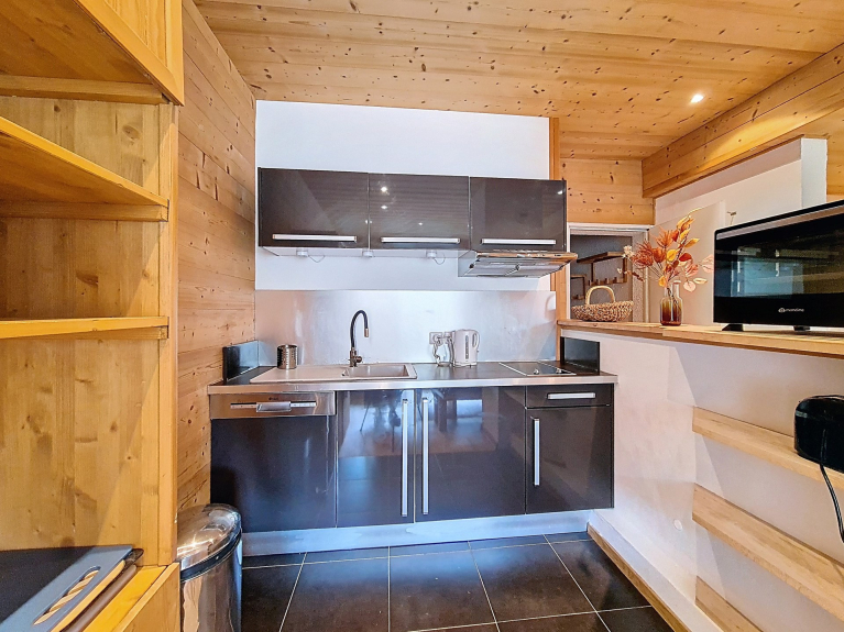 Cucina attrezzata con 2 piastre a induzione, cappa aspirante, forno tradizionale, frigorifero, microonde, lavastoviglie, bollitore, tostapane, macchina da caffè Senseo.