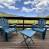 Terrazza con mobili da giardino, sedie a sdraio, ombrellone e barbecue.