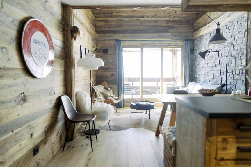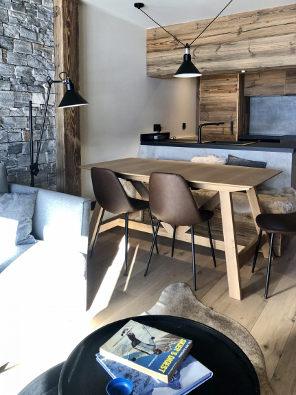 Ideale per 6-7 persone, l'appartamento "Vavril Ski aux Pieds" è stato completamente ristrutturato in stile chalet, con rivestimenti in legno antico e pietra, e offre servizi di alta gamma senza essere ostentato.