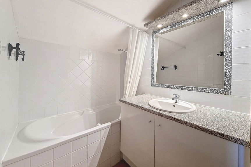 Camera da letto 3 con bagno: 2 letti singoli a castello e un letto singolo. Bagno con vasca.