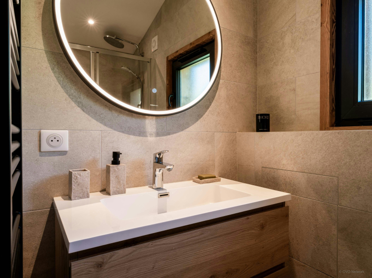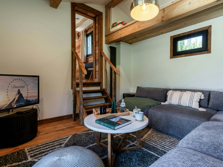 Le quattro camere da letto e i due bagni con WC dello Chalet Mushy sono suddivisi tra il piano superiore e il piano giardino. Il piano giardino beneficia anche di un comodo ingresso separato.