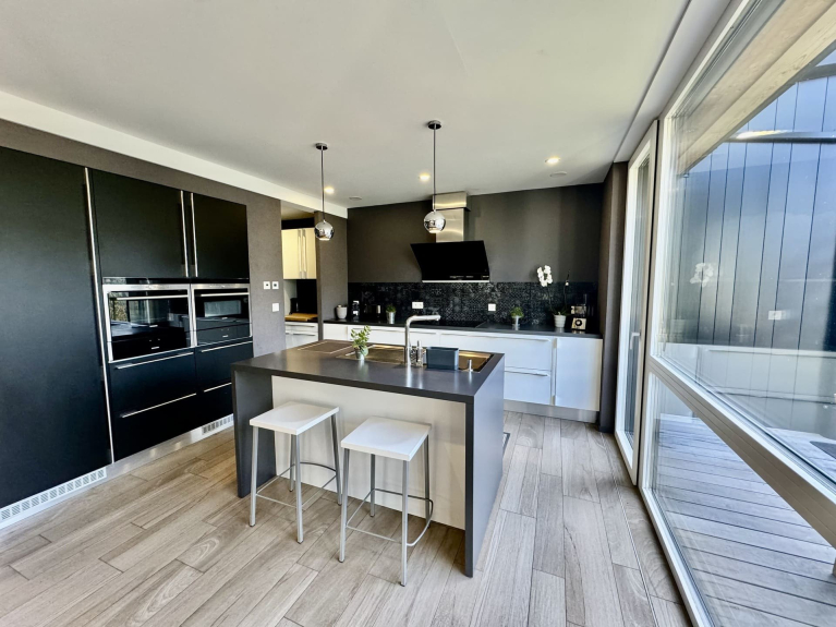 - Cucina attrezzata con isola centrale che si apre sulla terrazza.