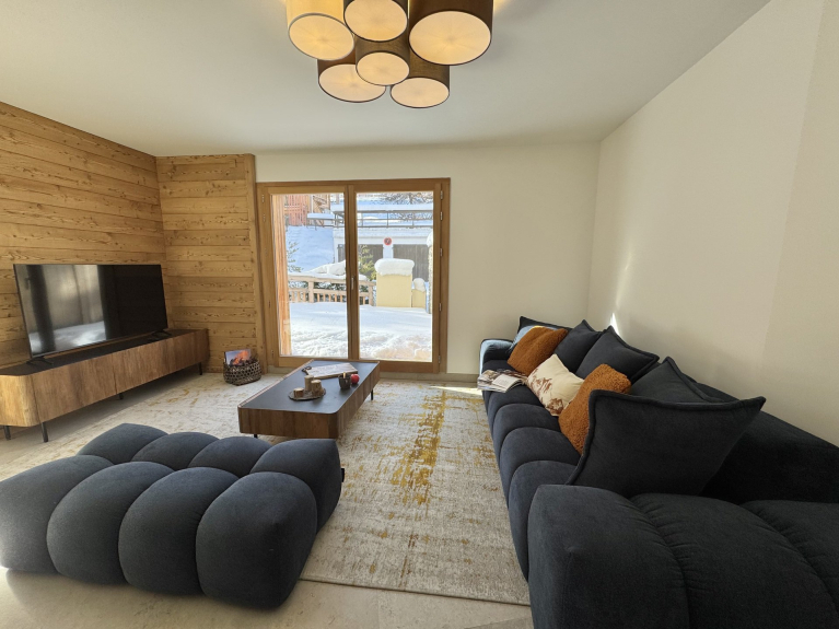 L'appartamento è arredato in stile chalet chic, creando un'atmosfera calda e raffinata, ideale per una vacanza memorabile sulle piste.