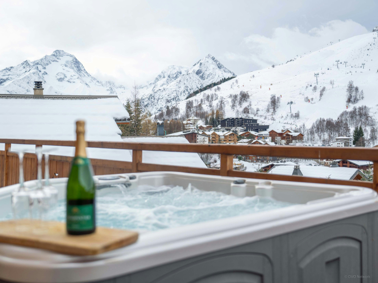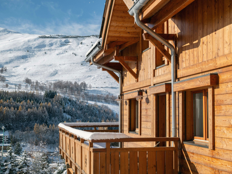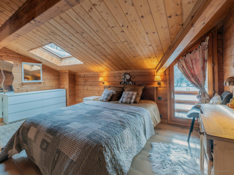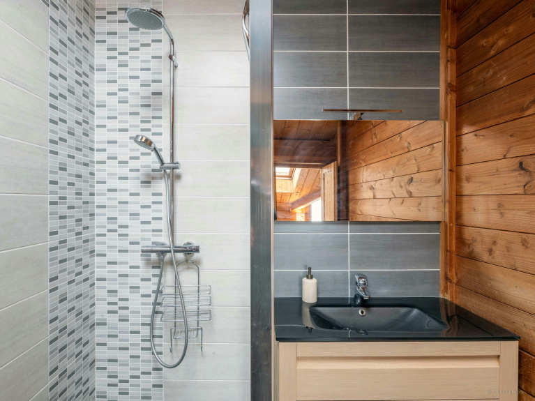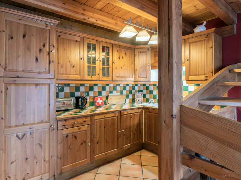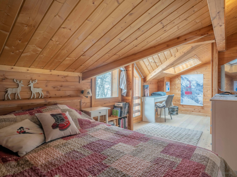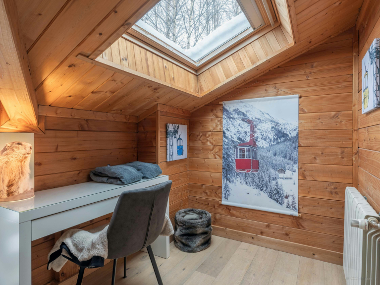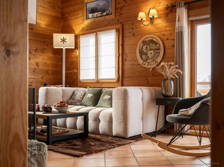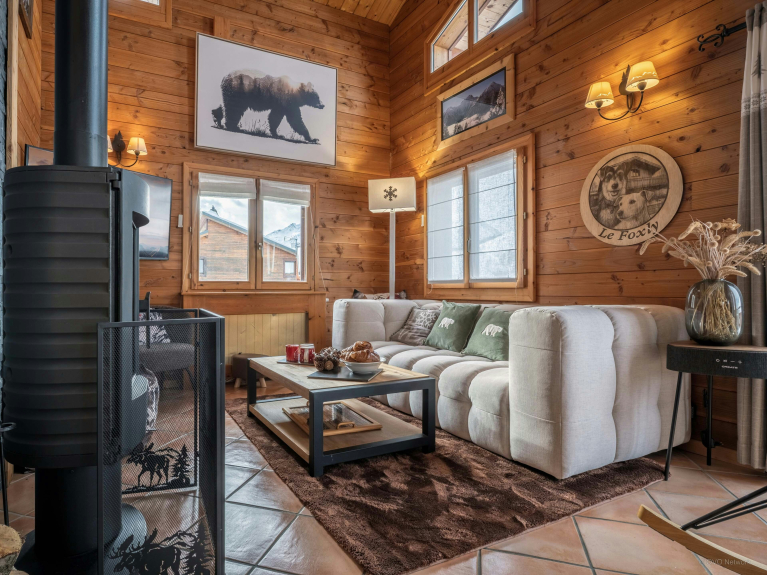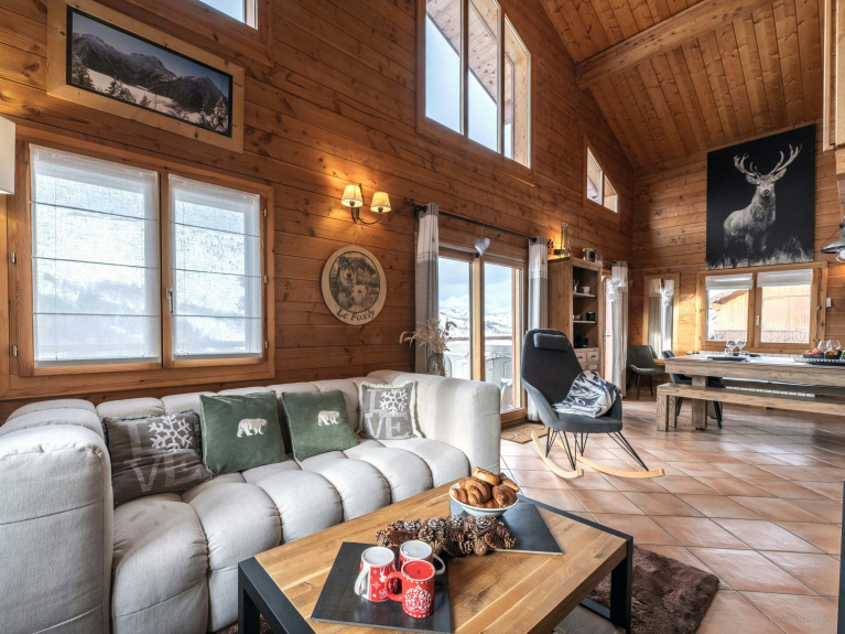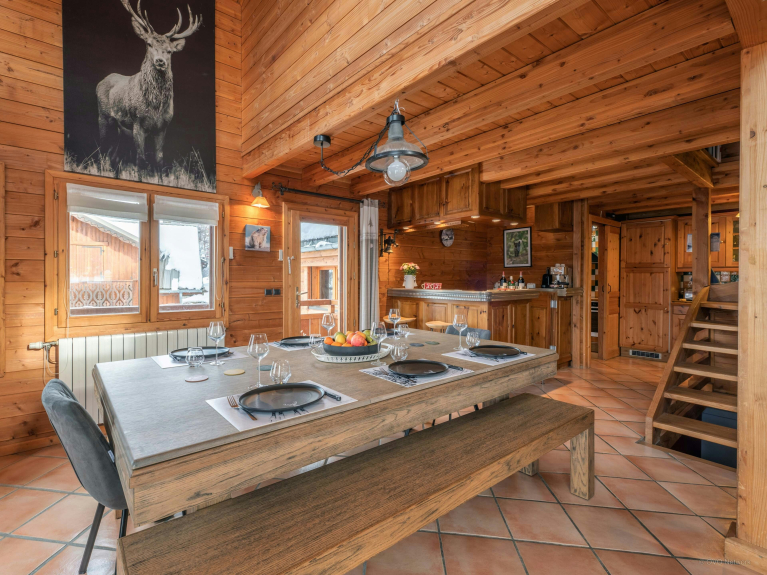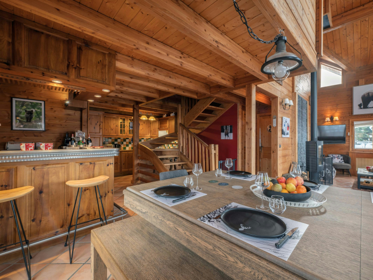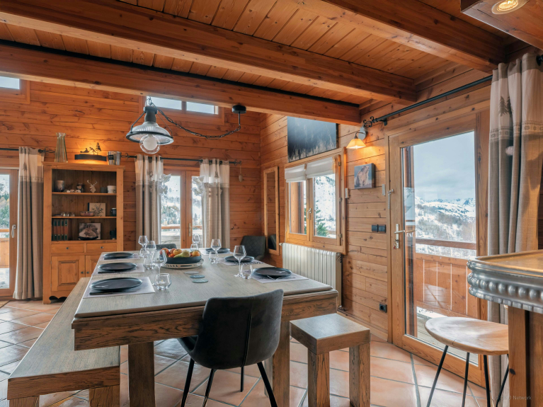 La zona giorno è uno dei punti di forza dello chalet. Il suo salone, con la stufa a legna, e il bancone rivestito in legno creano un'atmosfera calda non appena si torna dalle piste. La terrazza panoramica lo circonda su tre lati, per rilassarsi e ammirare il panorama.