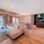 Accogliente soggiorno che si apre su una cucina a vista con 4 piastre in vetroceramica, forno, microonde, frigorifero, lavastoviglie, bollitore, tostapane e macchina del caffè elettrica.