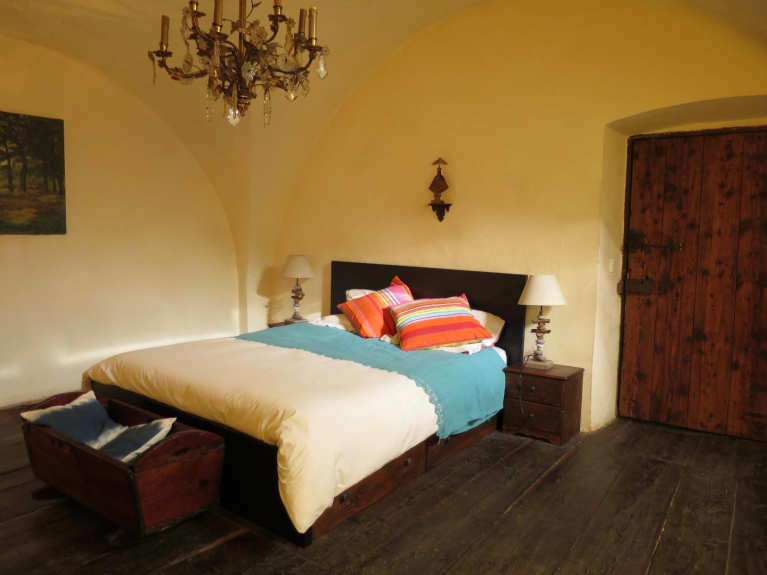 Un bel grande camino (con una stufa a legna) domina il soggiorno con soffitti a volta e pietra a vista.