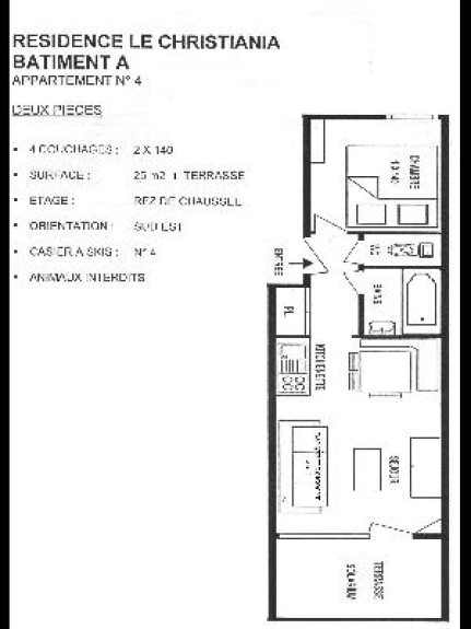 Situato al piano terra dello chalet LE CHRISTIANIA bât.A, bell'appartamento (27m2) ben attrezzato, tranquillo, con terrazza (6m2) ben esposta Sud Ovest, bella vista sulla montagna; si mettono gli sci all'uscita dello chalet;