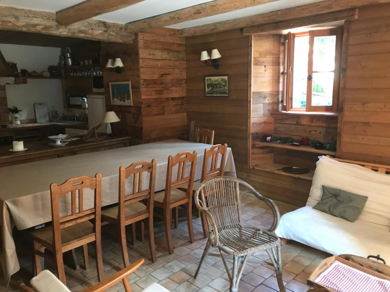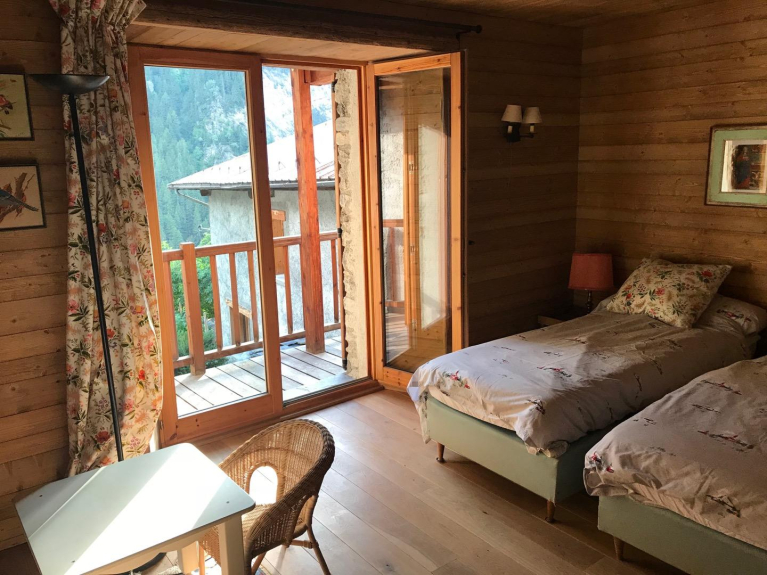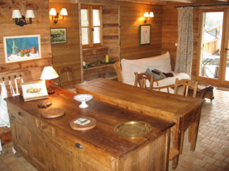 Noleggio da domenica a domenica. PARADISKI Collegamento diretto con Les Arcs e La Plagne. Portes PARC VANOISE in un autentico chalet savoiardo, interamente rinnovato, fascino e comfort, Appartamento per 11 persone su 2 livelli, decorazione in legno.