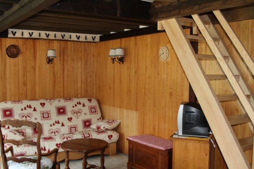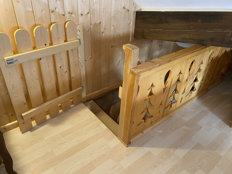 Chalet con pavimento in piastrelle, pavimento in parquet sul mezzanino.