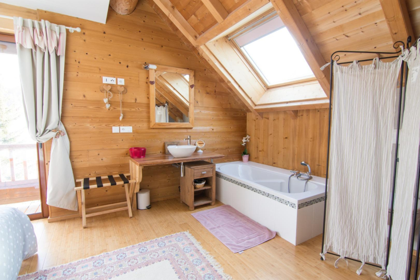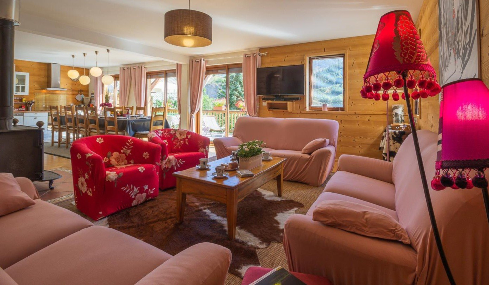 Lo chalet è spazioso, 180m2 su tre piani, può ospitare 12 persone. È confortevole e decorato con fascino e morbidezza.