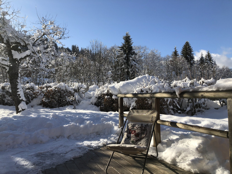 Jardin de 1000m² ombragé et grande terrasse ensoleillée plein sud avec transats, parasol, tables et fauteuils de jardin pour des déjeuners avec vue sur les alpages, le domaine de Rochebrune et la magnifique chaine des Aravis.