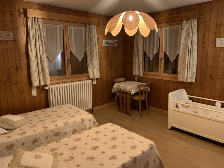 Une chambre avec 2 lits 90 cm + 1 petit lit de bébé en bois.