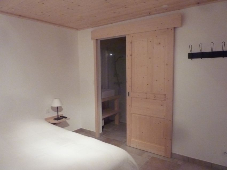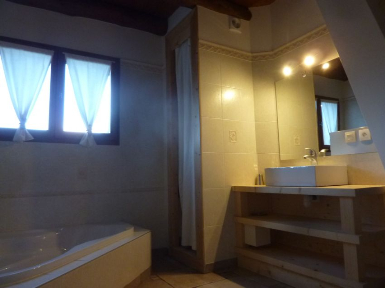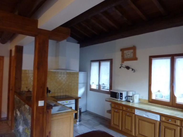 - Au rez de chaussée de la partie chalet située au dessus d'un appartement indépendant non loué: entrée - buanderie - chambre parentale avec salle d'eau - pièce à vivre avec cuisine US équipée, salle à manger avec grande table et salon avec poêle à bois - 2 WC indépendants - salle de bain avec baignoire d'angle et douche- balcon