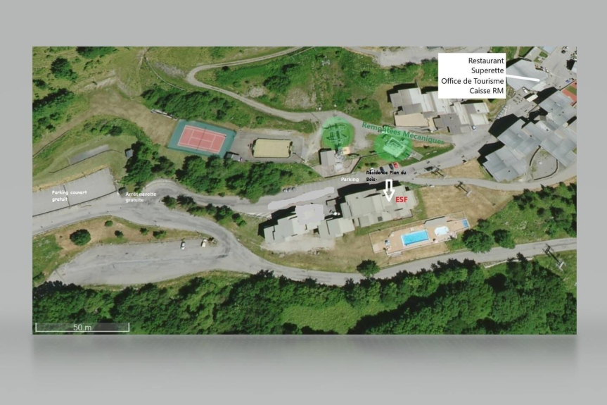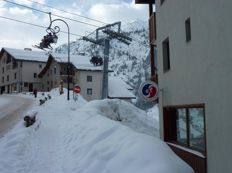 Centre du village à 50m : Caisse de vente des forfaits, office de tourisme, restaurants-bars, supermarché, magasins de sports, mur d'escalade.