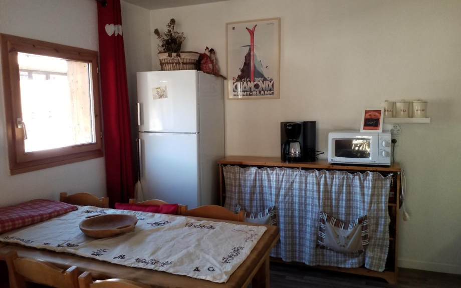 - Le séjour dispose d’un canapé lit pouvant accueillir une ou deux personnes, d’une TV écran plat, d’une table avec 7 chaises (avec coussin) + 1 chaise enfant. Accès direct sur un grand balcon.