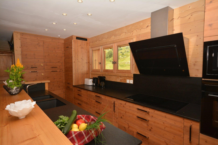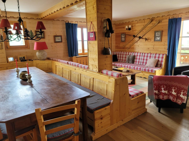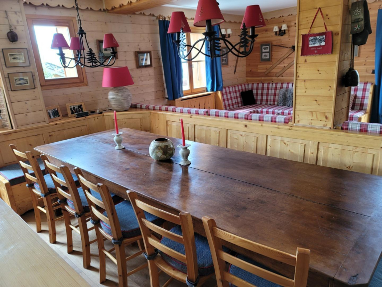 Très grand chalet d'architecture traditionnelle, tout en mélèze et en pierre. Les 7 chambres et 7 salles de bains en font un lieu de vacances très confortable et fonctionnel. Le chalet dispose de très belles vues sur les massifs environnants et d'un grand balcon exposé sud, est et ouest. L'espace sauna avec sa salle d'eau attenante contribuera au bien-être et à la détente de ses occupants. La suite parentale comporte une salle de bains avec baignoire et douche separées. Les six autres chambres sont toutes dotées d'une salle d'eau. La chalet est également équipé d'un ski-room avec un chauffe-chaussures et d'un grand garage. Vous pourrez aussi profiter de son jardin l'été, pour un moment de détente ou déjeuner ou simplement profiter du torrent qui le traverse.