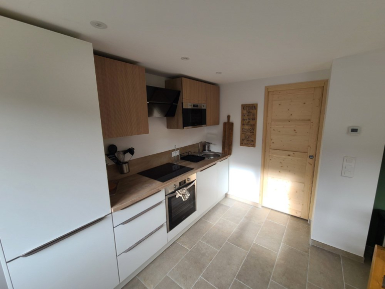 1 grand espace de vie chaleureux et très lumineux comprenant séjour, salon et cuisine (lave vaisselle, four, micro-ondes, plaques induction)