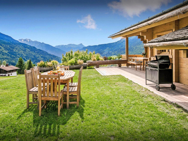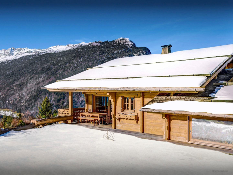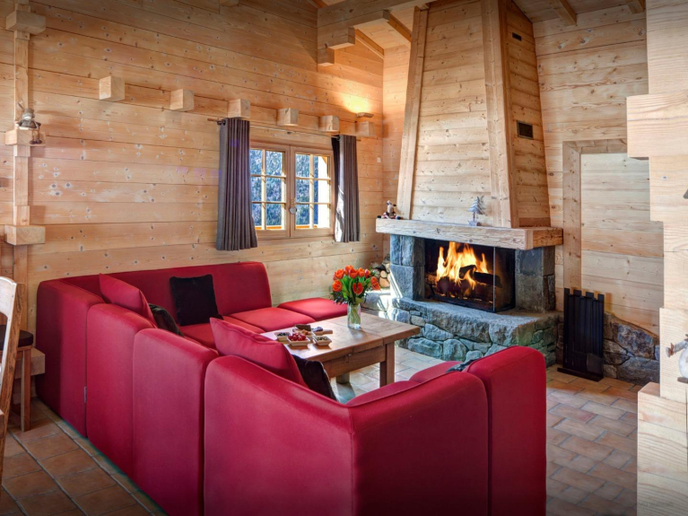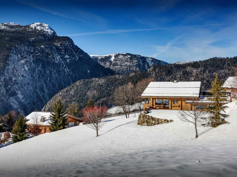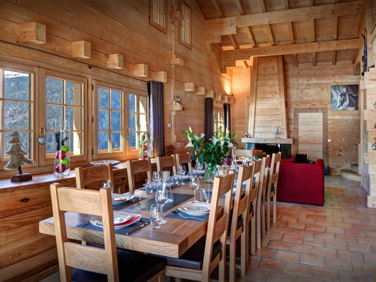 Cet élégant chalet s'organise autour de son vaste espace de vie, haut de plafond et bénéficiant de vues imprenables sur la vallée et les sommets.
