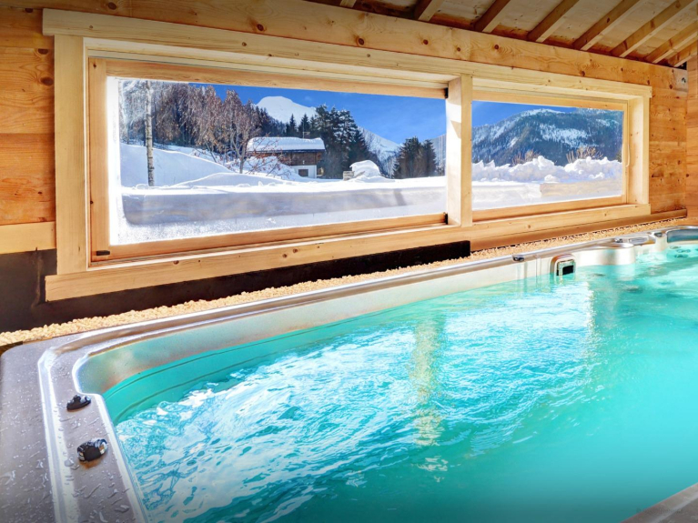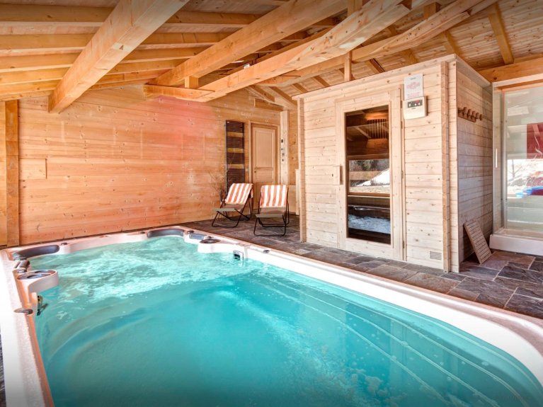 Offrez-vous le luxe d'un 5 étoiles dans ce vaste chalet tout confort: vous apprécierez les 220km de pistes du domaine skiable, le calme des soirées sous les étoiles et en fin de journée un moment de détente dans le superbe spa de nage ou une séance d'intense relaxation dans le jacuzzi et le sauna!