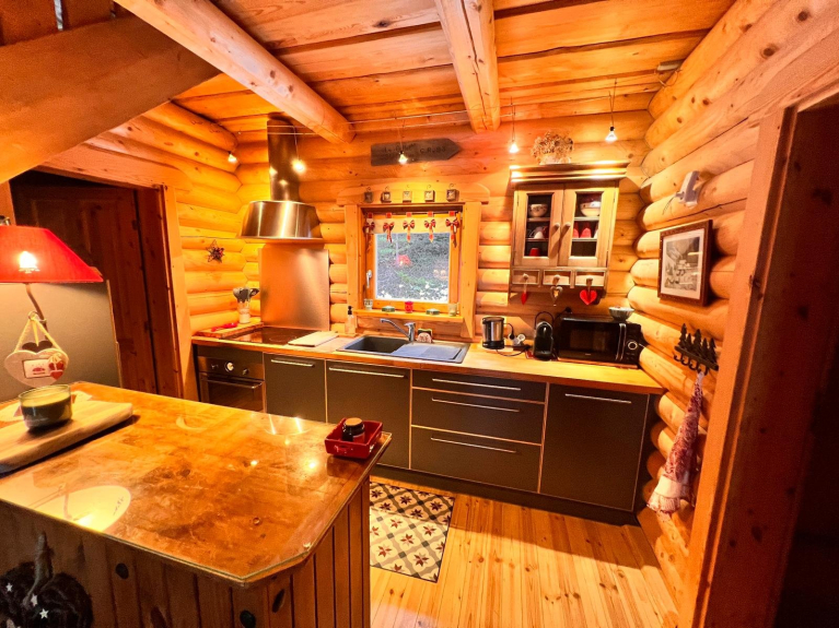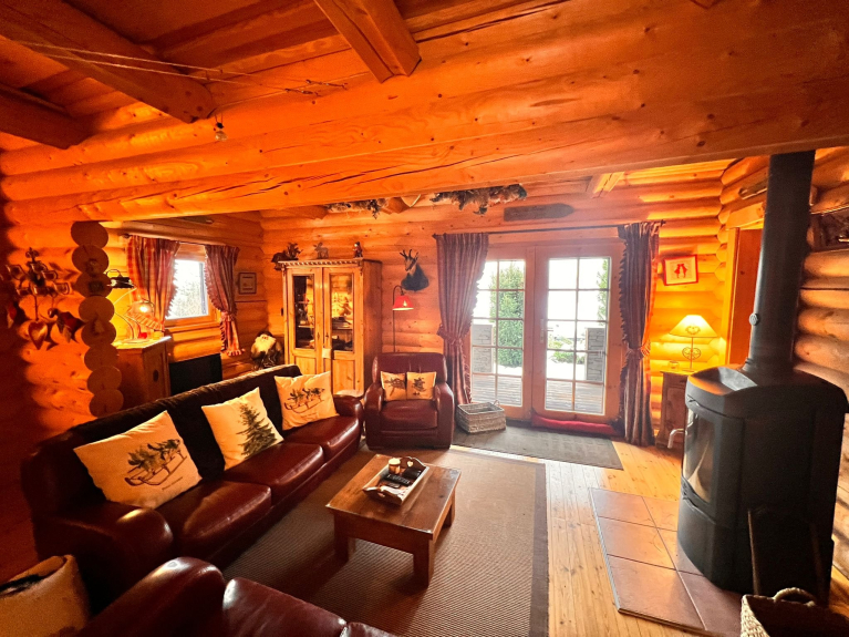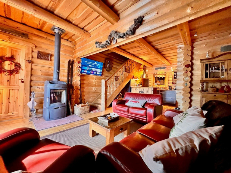 - Cuisine et salon convivial: profitez d'une cuisine américaine entièrement équipée, ouverte sur un coin repas chaleureux et un salon accueillant avec poêle, parfait pour des soirées au coin du feu. Une télévision murale complète cet espace de détente.