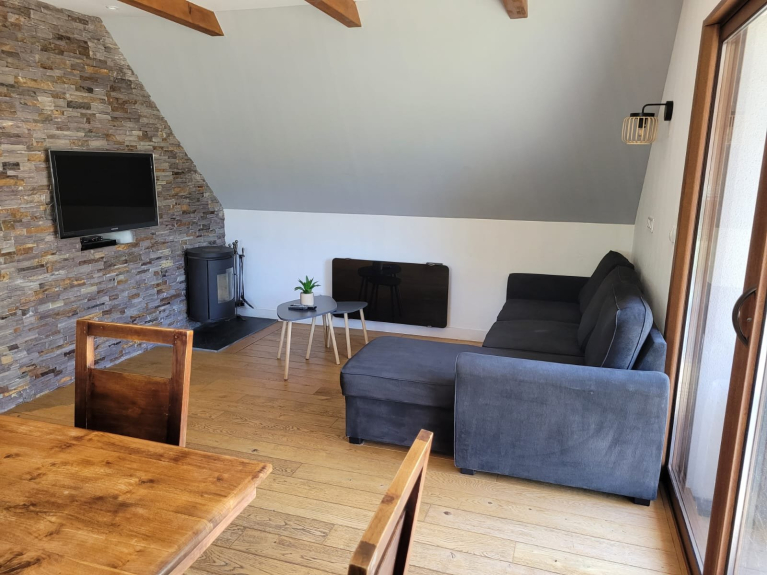 Ses prestations: poêle à bois, 1 téléviseur HD grand écran dans le salon avec home cinéma, 1 chambre avec un téléviseur équipé d’un lecteur DVD, accès internet, cuisine équipée (lave-vaisselle, four, micro-ondes, réfrigérateur-congélateur, plaque à induction, services à raclette et fondue), local à skis, une terrasse extérieure exposée Sud avec vue panoramique sur la vallée d’Aure, 1 salle d’eau, 1 sanitaire, barbecue, ... tout le confort d'un gîte Haut de Gamme au calme et en pleine nature.