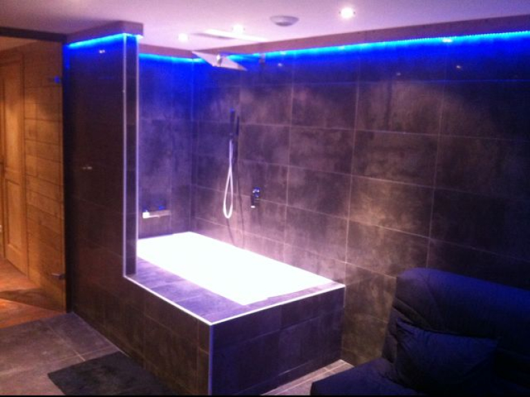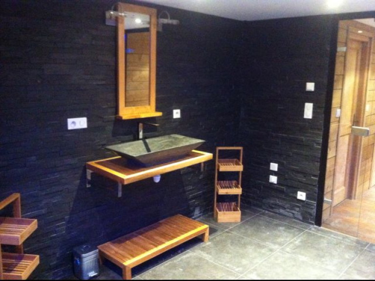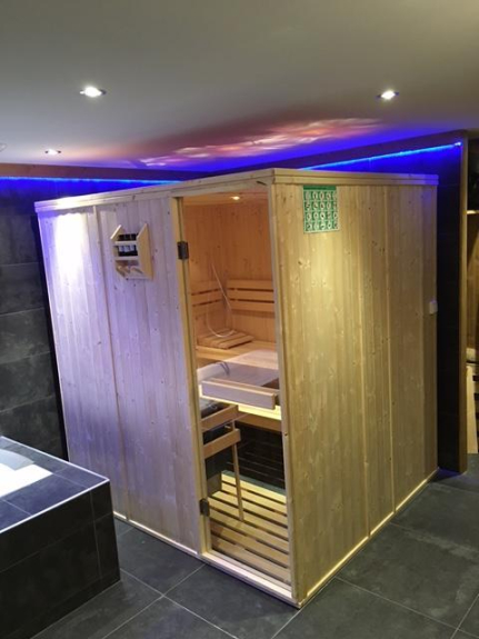 1 pièce détente avec baignoire Jacuzzi + sauna + plan vasque + banquette lit pour couchage 2 personnes + placards de rangement.