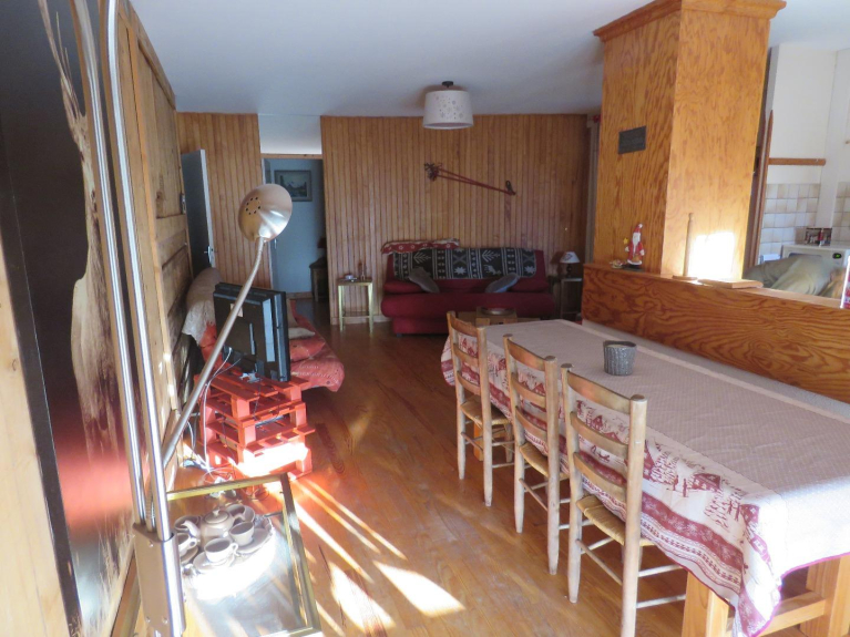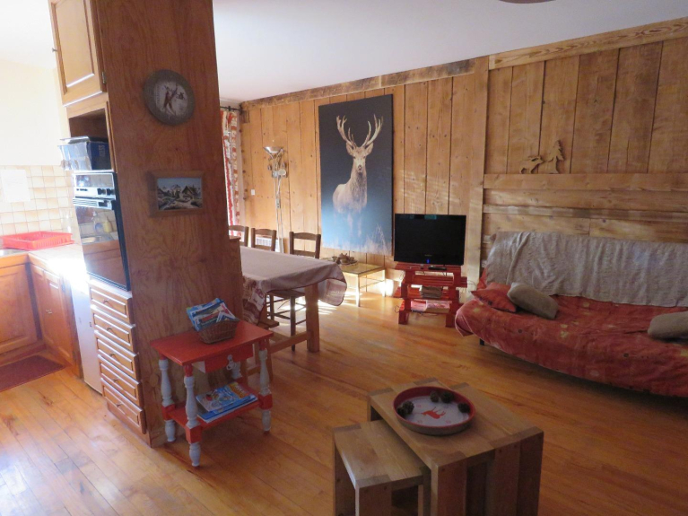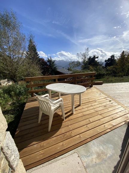 Au rez de chaussée d’un beau chalet de pierre et de bois, avec un grand terrain planté d’arbres, arbustes, framboisiers, cassissiers, groseillers, gazon, exposé sud, face à la chaîne de montagnes, très ensoleillé, au coeur du village (en i10 sur le plan de ville) proche des commerces (superette à 2 minutes à pied) dans le cadre calme d’un quartier de maisons et chalets avec jardins arborés. Pas de nuisance, en rez de jardin avec une grande terrase bois, très agréable avec possibilité de manger dehors, se reposer dans transat et profiter de l'espace vert ou blanc : maison calme. Le petit plus : Zone "wifi". lecteur de DVD.