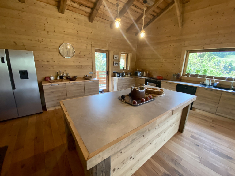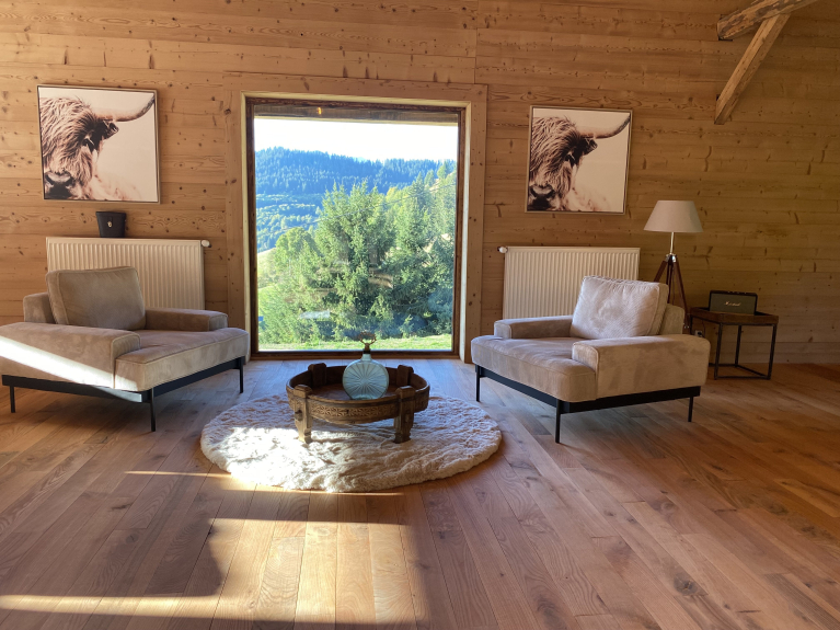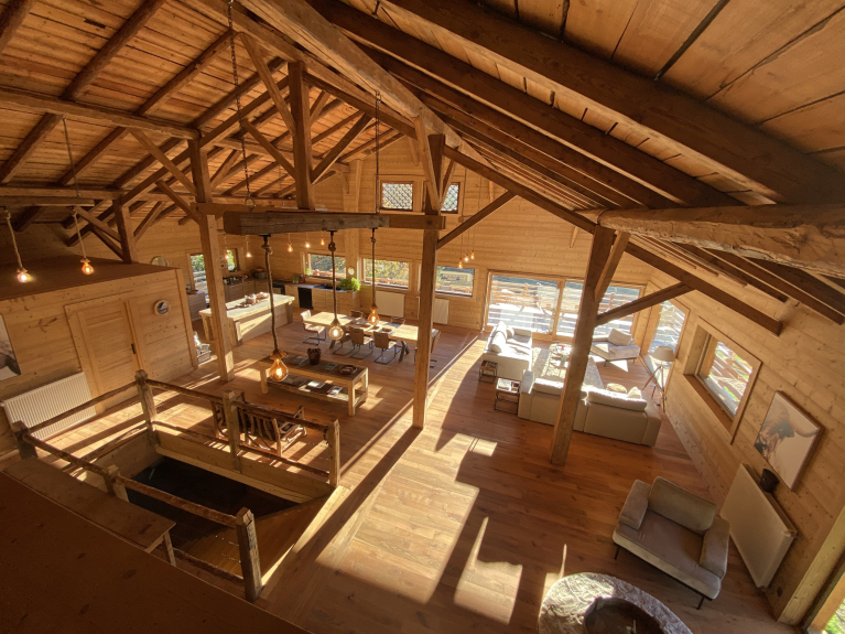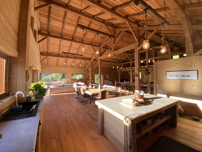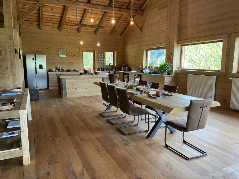 Le Chalet offre un grand espace de vie alliant l’authenticité avec un style contemporain.