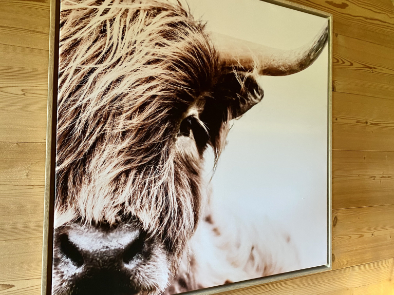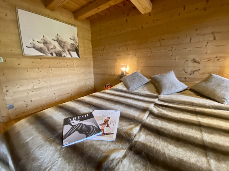 6 chambres spacieuses dont 1 chambre en mezzanine. Espaces de vie meublés dans l'esprit montagne -chic… poutres et boiseries anciennes, canapés, plaids en fourrure.