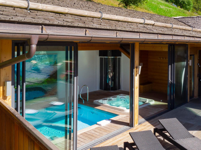 Nous mettons à votre disposition un espace avec piscine chauffée + jaccuzzi, un sauna, une lingerie, un barbecue, un garage, un local à ski avec sèche chaussures.