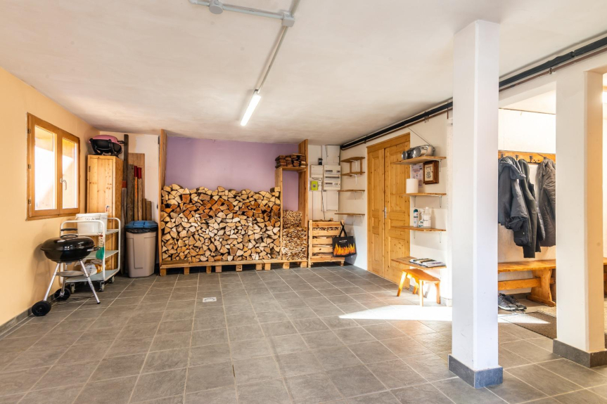 Au Rez de jardin : Parking extérieur possibilité d’accueillir 5 voitures ; l’hiver le parking est déneigé+ garage pour une voiture fermé avec porte automatisée (env.30 m²), une chaise haut pour Bébé, bois pour la cheminée (gratuit) et un barbecue