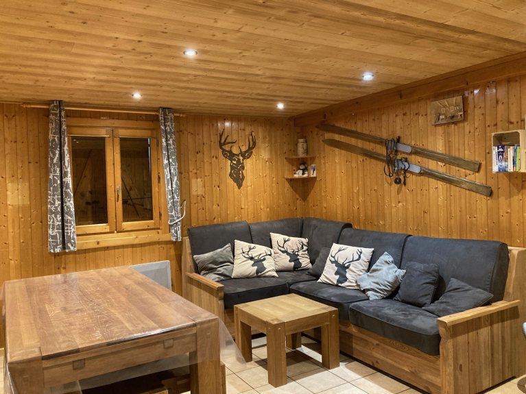 Chalet spacieux totalement équipé. La totalité des équipements, l'électroménager sont compatibles avec la capacité de 10 personnes. Parking devant chalet. Accès individuel, déneigement assuré chaque jour. Terrain attenant au chalet permettant les jeux des enfants. Navette à 20m du chalet, première piste à 200m.