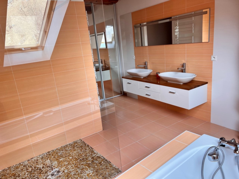 1 grande salle de bain avec baignoire + douche à l'italienne, 1 WC, et grande buanderie avec machine à laver et sèche linge.