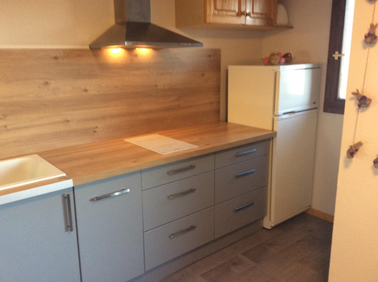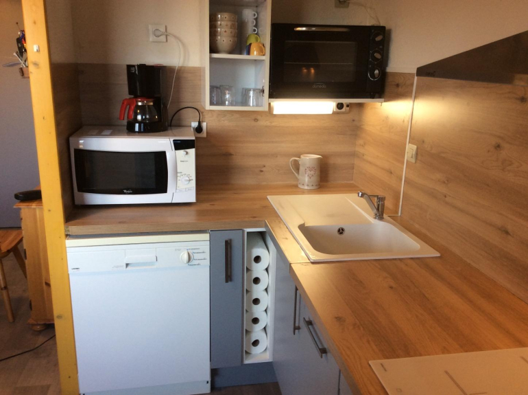 Cuisine avec machine à laver la vaisselle, four micro-onde, four, plaques vitro-céramiques.
