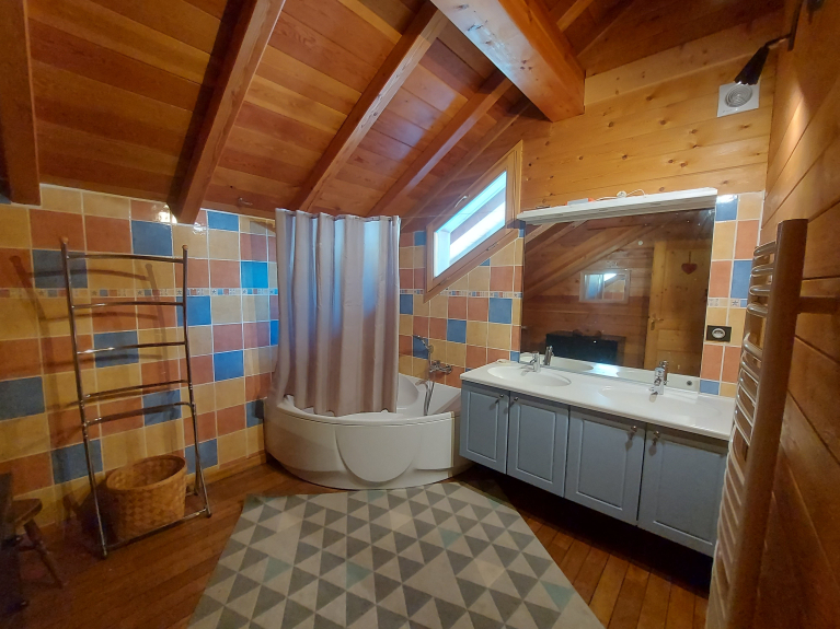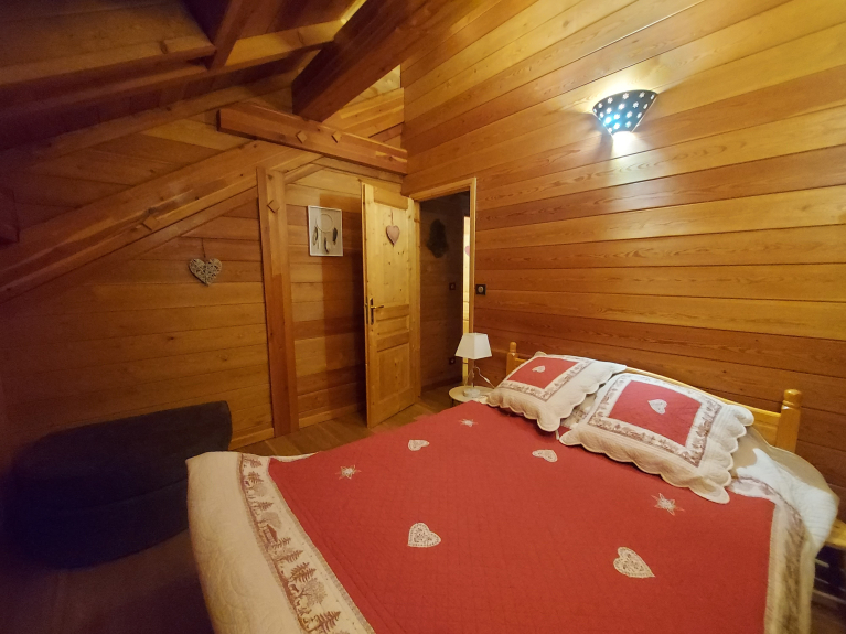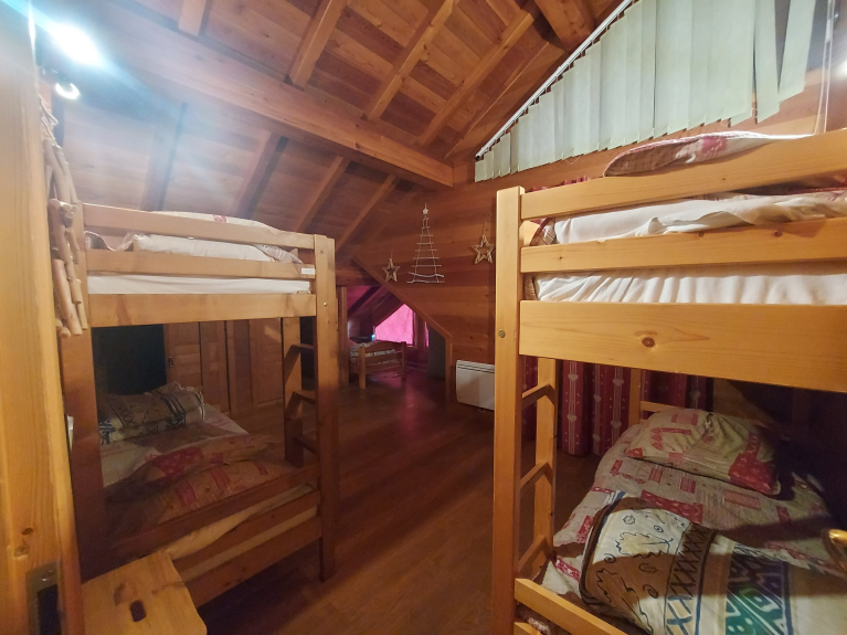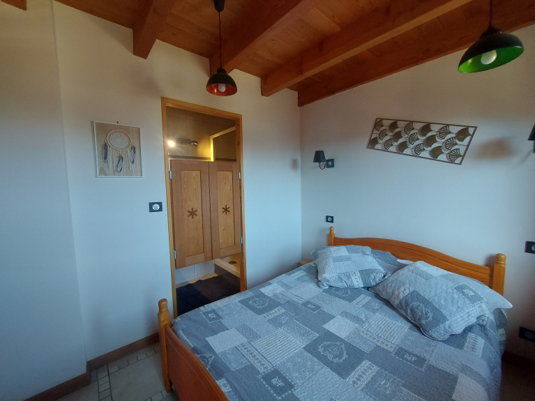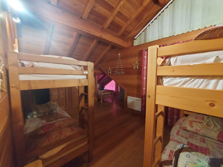 Appartement en rez de chaussée avec une grande terrasse plein sud. Cette location est composée de quatre chambres dont trois à l'étage : une avec un lit double, une seconde avec un lit double et un lit simple, un balcon, la troisième avec cinq lits simples et un balcon. A l’étage vous trouverez une salle de bain baignoire et lavabo double vasque et un WC fermé indépendant. Au premier niveau se trouve la quatrième chambre une suite parentale avec un lit double et une salle de bain douche avec lavabo. La pièce à vivre de plus de 40M² comprend un coin cuisine, un coin repas, une cheminée, et un espace détente avec vue dégagée sur nos belles montagnes. Tout le confort pour 12 personnes.