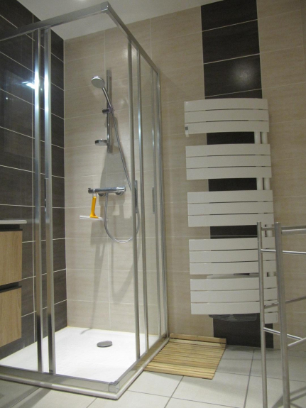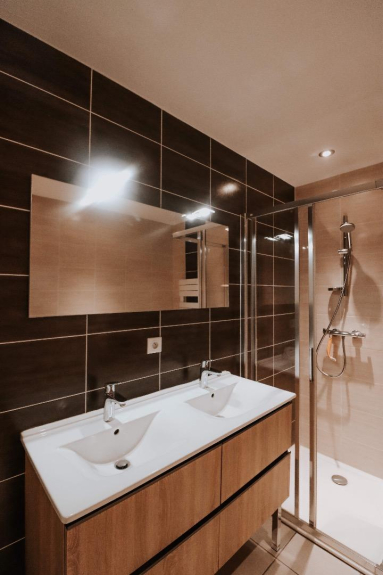 - salle de bain, avec douche et lavabo double vasque