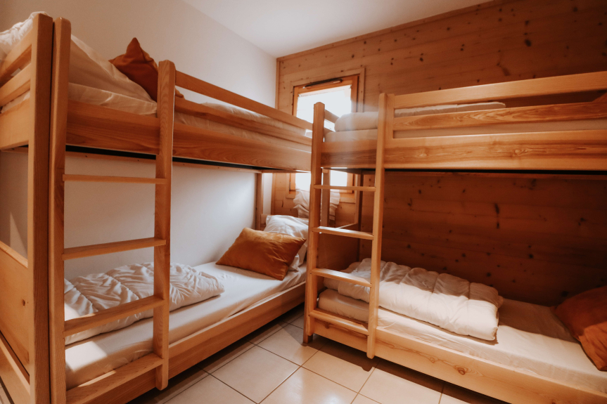 * chambre2 , 9m2 avec 2 x 2 lits superposés 80x190 (lit en hauteur ne convient pas aux enfants de moins de 6 ans, convient aux adultes), rangements.