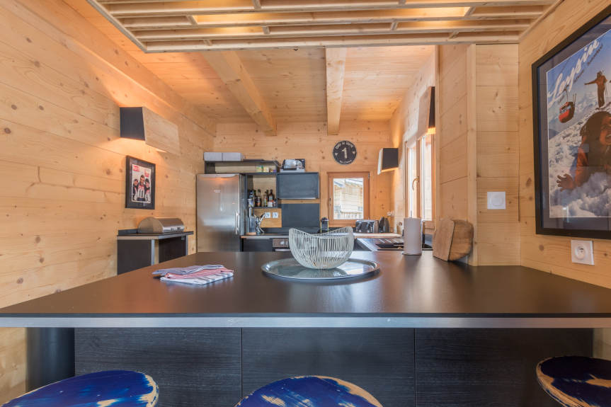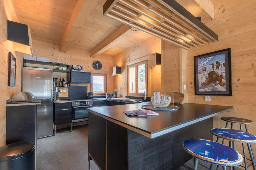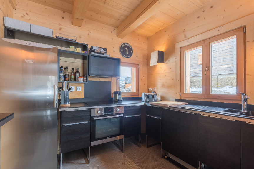 - Une cuisine équipée avec notamment : bouilloire électrique, four, four à micro-ondes, grille-pain, lave-vaisselle, plaques de cuisson, appareils à raclette et fondue,...