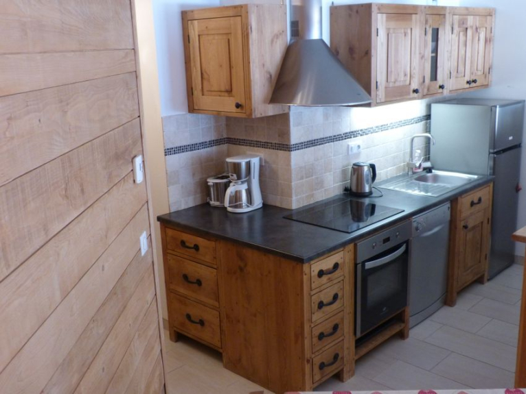 1 cuisine équipée avec plaques vitrocéramique, micro ondes, grand four, lave-vaisselle, réfrigérateur avec compartiment congélateur séparé, cafetière électrique et cafetière Nespresso, grille-pains, appareils à raclette, à fondue, à crêpes et gauffrier.