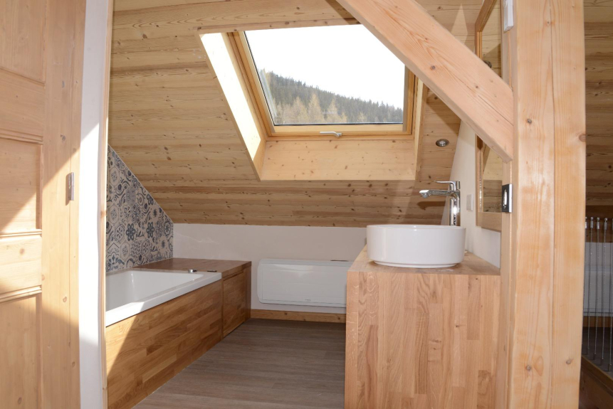 Au niveau R+1, le chalet bénéficie de 2 chambres, d'une salle de bain (baignoire et douche) , WC indépendant et espace mezzanine.