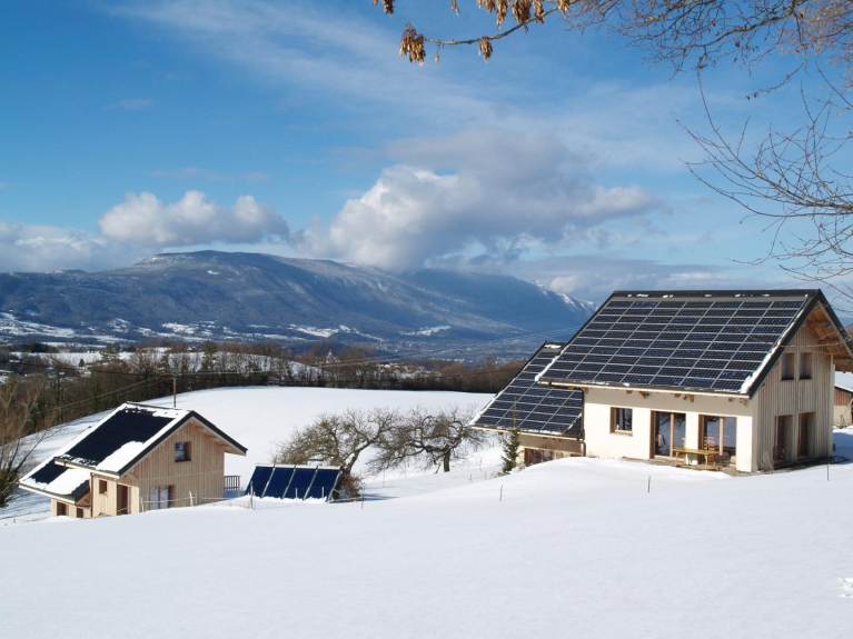 La façade principale ainsi que la toiture sont orientées au sud décalée de 15° vers l’ouest. Cette orientation a été choisie en tenant compte des masques existants (montagne au sud-est).
