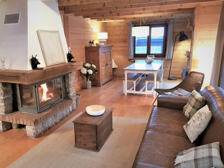 *** SURFACE HABITABLE PLAN OUVERT - FEU OUVERT: Situé au 1er étage, la salle de séjour et salle à manger a conservé son feu de bois d'origine, et a été conçu pour offrir le mélange parfait de l'ancien et le nouveau. Un grand balcon court le long du chalet exposé plein sud, offrant une vue imprenable sur le jardin, la vallée et les montagnes.