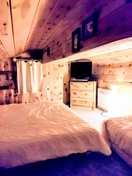 Au deuxième niveau se trouve un coin télévision et jeux sur la mezzanine et une chambre (15m2) sous les toits (hauteur 1m50) avec des lits posés à même le sol.