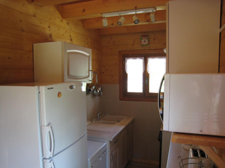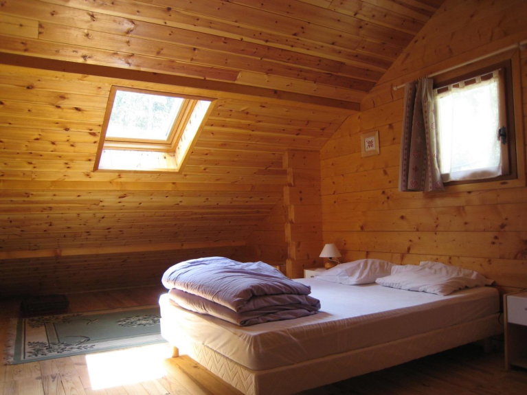 Chalet en bois de 80M2 avec mezzanine, cuisine ouverte sur salon, salle d'eau, WC séparé, jardin avec barbecue