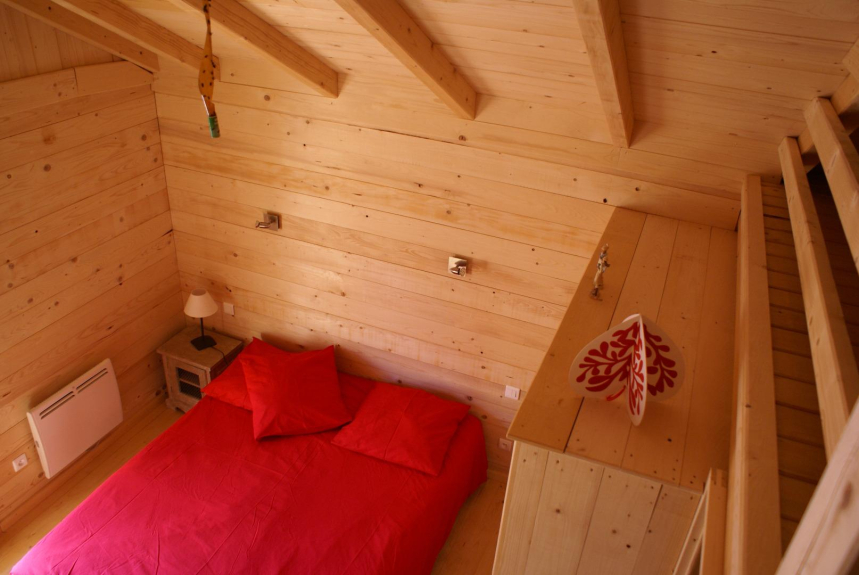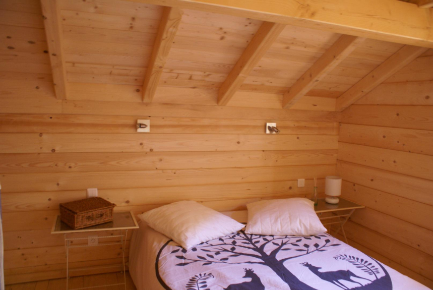 A l’étage une chambre avec un lit deux places ,une mezzanine avec escalier est ouverte sur cette chambre et dispose d'un lit d'appoint .