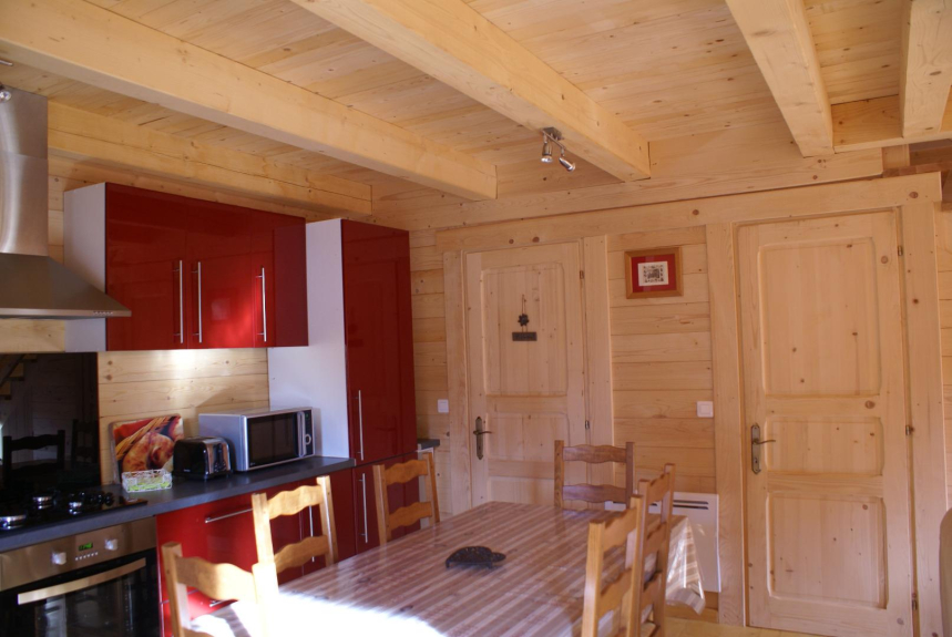 L'appartement l’églantier est constitué d'une cuisine aménagée ouverte sur la pièce a vivre, équipée d'une grande table et chaises , tout le nécessaire pour cuisiner.