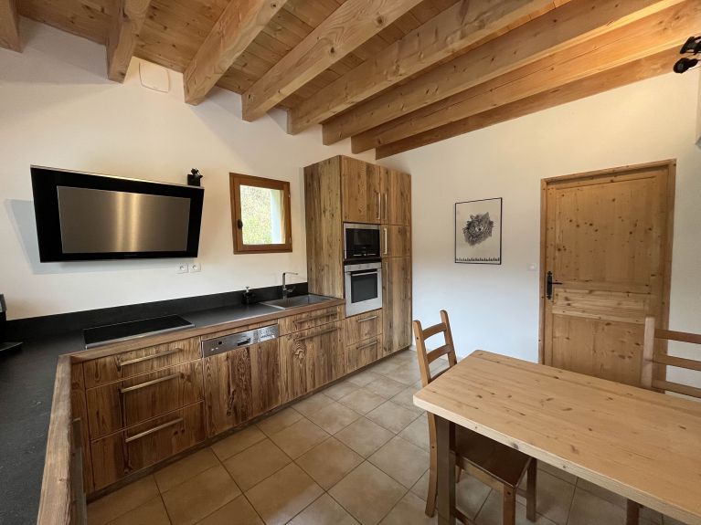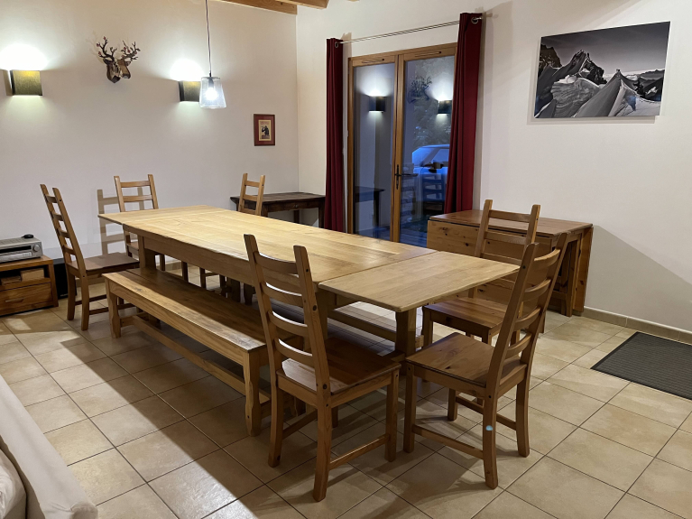 Chalet récent 4* tout confort pour 15 personnes avec jardin. Départ télésiège Girodière à ~200m par route ou chemin privé. 5 chambres avec lit 2p 140x200 et un dortoir avec 5 lits 1p. Grande pièce a vivre 62 m2 avec une table de 3,2x0,9m et des tables d'appoints. Equipements: cafetière Nespresso et cafetière a filtre, bouilloire, Sodastream, plaques induction, four a pyrolyse, lave vaisselle, lave-linge et sèche linge, Wifi, TV, babyfoot, lit bébé (parapluie). Location du Dimanche au Dimanche seulement